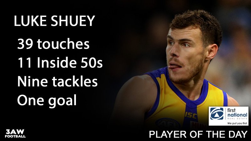 The Norm Smith Medallist was supreme for the Eagles in the wet against Hawthorn. With the game in the balance during the last quarter Shuey collected 15 disposals and six clearances to will his team across the line in a thriller.