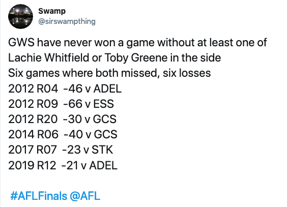 Forwards – GWS’ tall forwards have been strong this year, bolstered by the rise of Jeremy Finlayson, the flexible, unerring left footer. Add in Coleman Medallist Jeremy Cameron and Harrison Himmelburg and it’s difficult to cover. It’s hard for dashers like Howe and Moore to come off their men when the consequences can be damaging. Greene will be missed here as GWS most creative small forward.