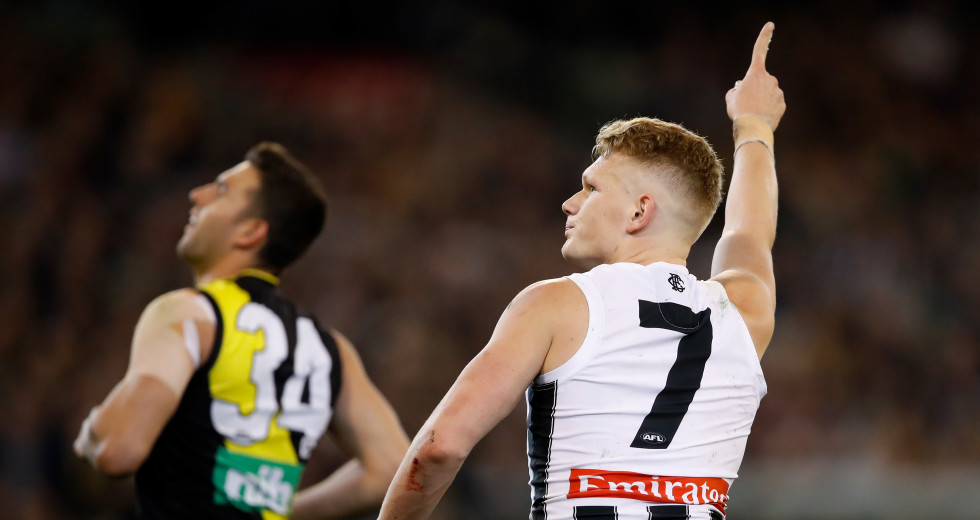 In his tenth year at Collingwood and at only 28, still plenty to come. Skilled player equally adept on both sides of his body. Damaging on the wing, in the midfield or forward. Sidebottom was 2nd in the Brownlow in 2018, dual Copeland Trophy winner and All Australian 2018.