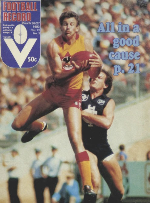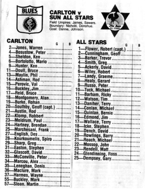 Captained by Melbourne’s Robbie Flower, the All-Stars had the likes of Trevor Barker, Gary Dempsey, Michael Roach, Bernie Quinlan, Gerard Healy, Michael Tuck and Tim Watson among their number. So strong was the squad it prompted Jeans to declare, if they were unsuccessful in toppling the two-time defending premiers, that Carlton was unbeatable. “If we can’t beat Carlton with some of the best players from the other 11 clubs, it may well be that Carlton could make it three in a row,” he told the Football Record.