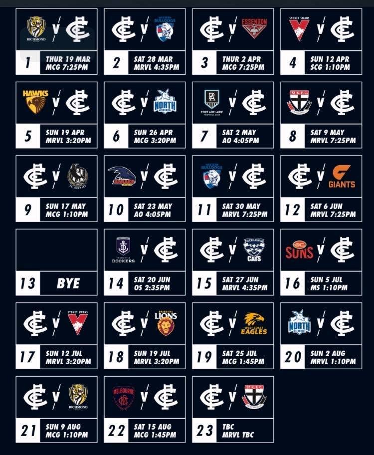 Labeling it the ‘fixture for everyone’ the Blues have every reason to be happy with their 2020 schedule. Opening the season with their traditional showdown with the Tigers, Carlton play in every mainland state but face double up encounters with just two finalists – Richmond and Western Bulldogs. They will be excited by the prospect of two games against non-finalists – St Kilda, Sydney and North Melbourne, and the prospect of seven games in Melbourne to round out the season.