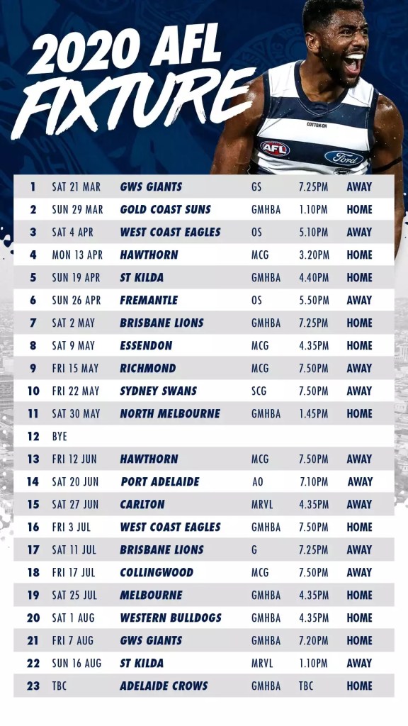 The Cats play nine games at GMHBA Stadium, which is almost a fortress now, as well as five at The G and two at Marvel giving them 16 games in Victoria. Double up games against West Coast, Brisbane, GWS, StKilda and Hawthorn will be testing and should hold them in good stead come finals time. Overall the draw for season 2020 is a lot more friendly than last season.