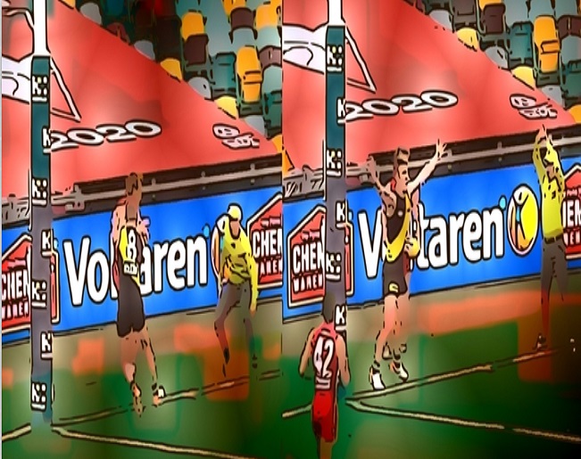 While we thought the ridiculous holding the ball decisions against Rowan Marshall and Nick Coffield in the St Kilda-Fremantle game would be hard to beat, we only had to wait one day to learn we were wrong. On Sunday, we were treated to the sight of Callum Mills being pushed across the goal line by Jack Riewoldt then penalised for deliberately rushing the behind.