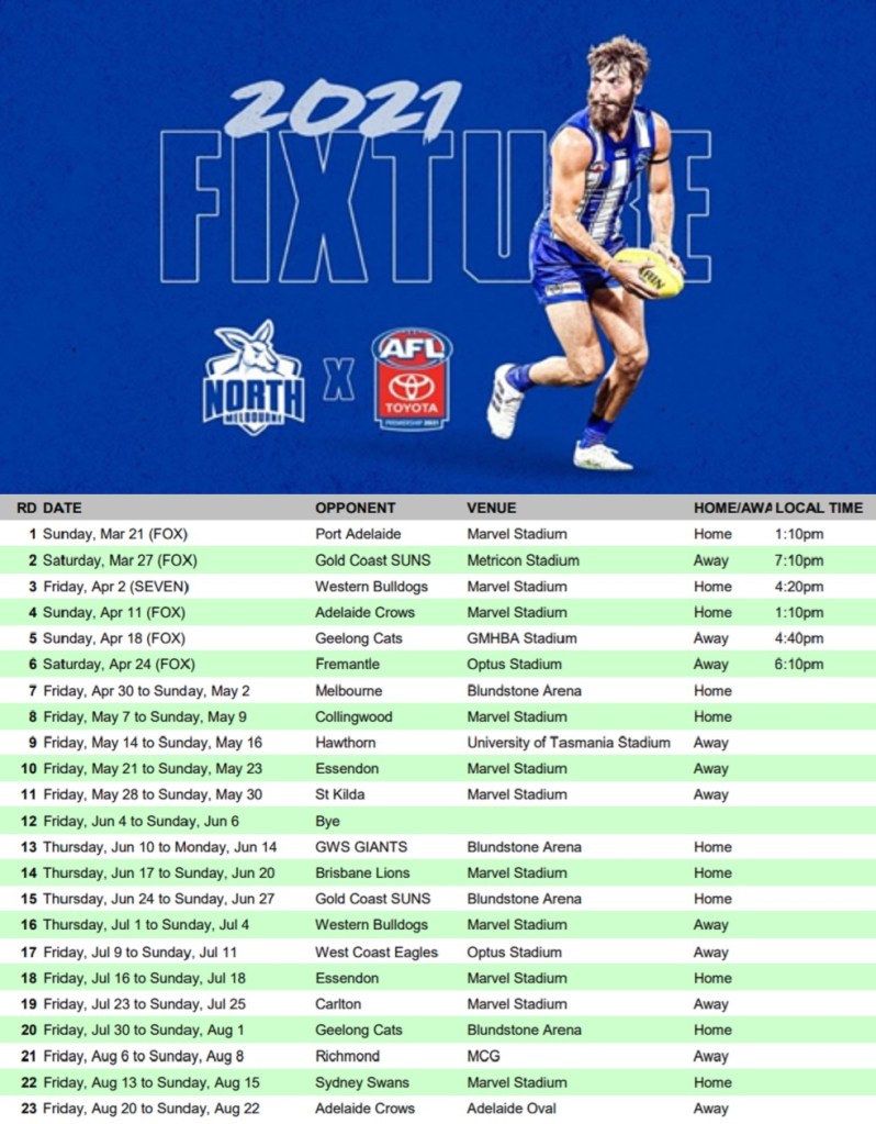 The fixture for North looks reasonable, starting the season playing three out of the first four games at Marvel Stadium. This should give North Supporters a good close look at the fresh potential ‘stars’. We don’t play in Sydney; we do however play Hawthorn at the University of Tasmania Stadium and play both Fremantle and West Coast in Perth .